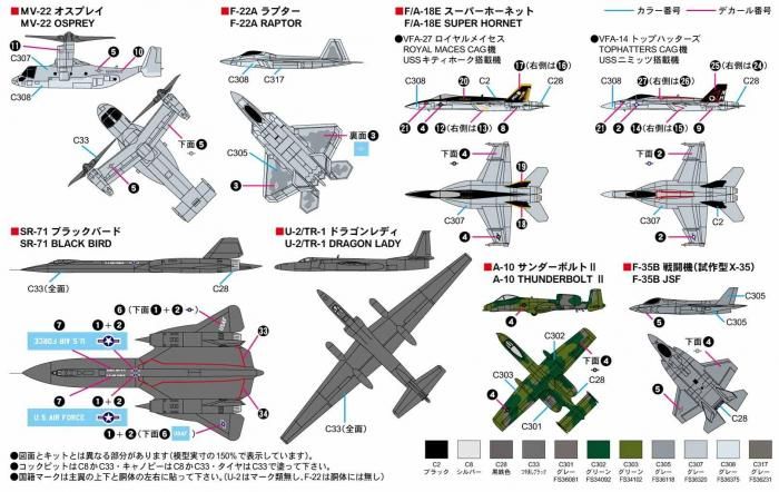 MV-22 オスプレイ、F-22A ラプター等の現用の最新鋭機から、永らく使われてきたA-10 サンダーボルトII、U-2/TR-1ドラゴンレディ 及び、往年の名機 SR-71 ブラックバード まで、幅広く人気のアメリカ軍用機をチョイスしたセットです。