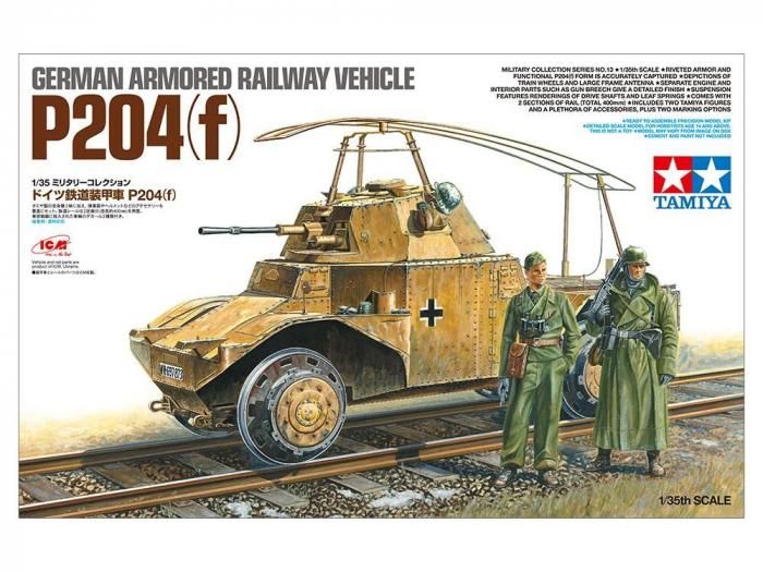 【 模型要目 】 ドイツ軍の鉄道装甲車P204(f)の1/35スケール、プラスチックモデル組み立てキットです。★全長145mm、全幅57mm。平面で構成されたリベット接合式の武骨なスタイルを実感豊かにモデル化。★鉄道用車輪や大型フレームアンテナもリアルに再現。★エンジンや無線機、主砲装填部などもパーツ化。エンジン点検ハッチなどは開閉選択式で、内部の構造を観察できます。★4輪駆動の足まわりもドライブシャフトやリーフ式サスペンションなど立体感あふれる仕上がり。★鉄道レールは2区画分(全長約400mm)を用意。★コート姿の兵士と士官の全身像はタミヤ製。★情景製作に便利に使える弾薬箱やヘルメットなどのアクセサリーも豊富にセット。★デカールは東部戦線に投入された車輌2種類が選べます。