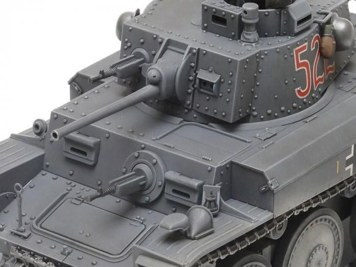 【 独ソ戦の先陣を切ったチェコ製軽戦車 】 1939年にチェコを併合したドイツは、チェコ製のLTvz38軽戦車を自軍向けに38(t)軽戦車として制式採用しました。車体と砲塔はリベット接合式、主砲には3.7cm戦車砲を備え、機動力にも優れた38(t)軽戦車は、初期の電撃戦などで奮戦。その後も改良が加えられてG型まで発展し、シリーズ合計で1,400輌以上が生産されました。中でも各部に装甲板を追加して防御力を高めたE/F型は、1941年6月からの独ソ戦初期に数多く投入され、ドイツ戦車部隊の一翼を担いました。