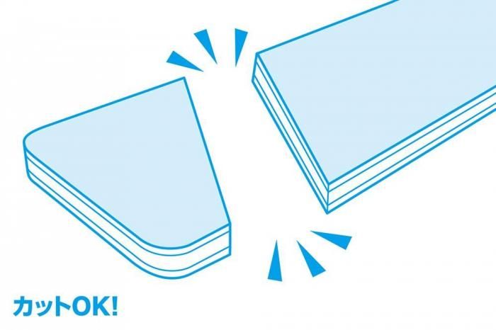 ヤスリスティック本体は、芯になる中央部には硬質ベースを、その上下を軟質ベースではさんだ3層構造とし、両面に紙やすりをセットしました。 ヤスリスティック本体はお好みの形に切り出すことができ、作業場所にあわせた形状に加工することができます。