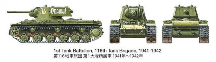 【 祖国防衛のために戦ったグリーンの巨体 】 1939年に制式採用されたソ連軍の重戦車がKV-1です。様々なタイプが生産されたKV-1の中でも、1941年型と呼ばれる車輌は、主砲に同時代のドイツ戦車の装甲を遠距離から貫徹できる長砲身の76.2mm砲ZIS-5を搭載。初期の生産車は、装甲鋼板を溶接して組み立てられた基本装甲厚75mmの砲塔を備えていました。1941年6月、独ソ戦の開戦と共に出撃したKV-1は、高い防御力と攻撃力を活かして粘り強く防戦。無敵を誇ったドイツ軍を食い止め、その後のソ連軍の勝利に大きく貢献したのです。