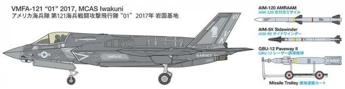 【 模型要目 】 F-35Bのプラスチックモデル組み立てキットです。★1/72スケール、全長217mm、全幅150mm。★ステルス機特有の先進的な姿をリアルにモデル化。★エンジンノズルは下方に向けた状態にも組み立てられ、リフトファン空気吸入口や補助空気吸入口などは開閉選択式。短距離離陸/垂直着陸時の状態を再現できます。★GBU-12レーザー誘導爆弾など兵装類も豊富に用意。★キャノピーや爆弾倉ドアも開閉が選べます。★レーダー波吸収シートのパターンは主要な部分をデカールで表現。★タミヤ製のパイロット人形1体、米海兵隊のマーキング2種類付き。