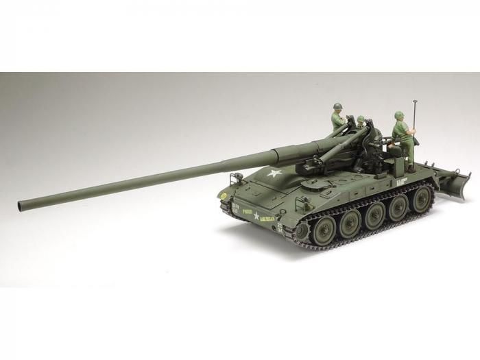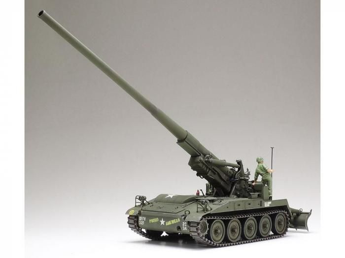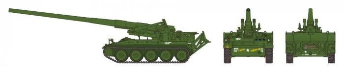 【 最大級の射程を誇った自走砲 】 1956年に開発がスタートしたアメリカ陸軍の自走カノン砲がM107です。輸送機による空輸を可能とするため小型軽量にまとめられた車体に、長砲身175mmカノン砲をオープントップで搭載。最大射程は約32kmと車載砲としては当時最大級の射程を誇りました。発砲時の安定性を確保するため、車体後部には大型の油圧スペードを装備。乗員は車長と操縦手、そして砲手3名の合計5名でした。1961年に制式採用され、1965年にベトナム戦争で初めて実戦投入。特に1968年のケサン基地をめぐる攻防戦で威力を発揮し、非武装地帯を挟んでの砲撃戦でも北ベトナム軍砲兵部隊を圧倒しました。アメリカのベトナム撤退後、残されたM107は南ベトナム軍へ移管され、1975年のサイゴン陥落まで使用されました。