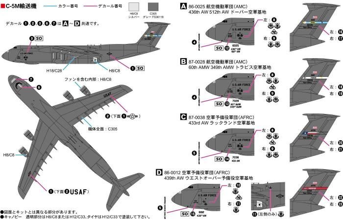 ・付属デカール:ドーバー、トラヴィス等のアメリカ空軍航空機動軍団(AMC)2種、空軍予備役軍団(AFRC)2種