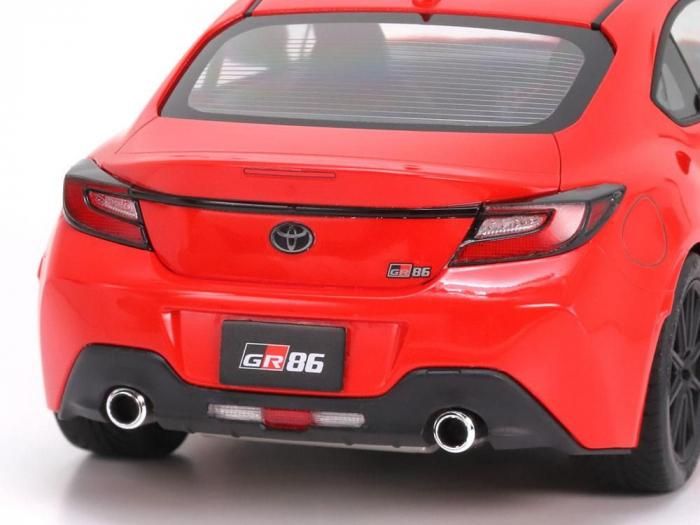 【 話題を集める2代目FRスポーツカー、その進化を模型で探る 】 2021年4月に世界同時公開されたFRレイアウトのスポーツカーがトヨタ GR 86です。ワイドなスタンスと低重心を表現したスタイルは、モータースポーツ参戦を意識した空力アイテムを採用。ルーフやフロントフェンダー、ボンネットにアルミ材を使用するなど、軽量化も追求しています。エンジンは235馬力を発揮する軽量コンパクトで低重心な2.4リッター水平対向4気筒DOHCを搭載。足まわりはフロント・ストラット、リヤ・ダブルウィッシュボーン式。FRならではのダイレクトで気持ちのいい走りをさらに進化させました。