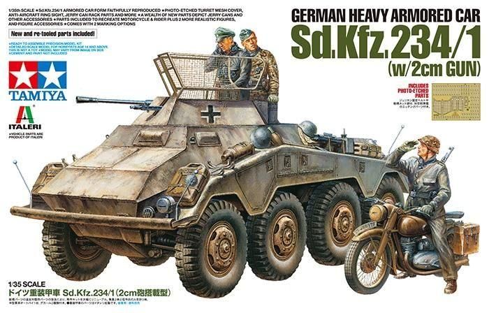 【 模型要目 】 Sd.Kfz.234/1(2cm砲搭載型)のプラスチックモデル組み立てキットです。 ●1/35スケール、全長185mm、全幅66mm。 ●イタレリ社の秀作キットをグレードアップしました。 ●砲塔のネット部分や対空照準環、ジェリカン固定ベルトなどはエッチングパーツで再現。 ●車体各部の装備品やジェリカンなども新規パーツに刷新。 ●部品の取り付けガイドや合わせも追加して組み立ての確実性が向上しました。 ●個人装備品を豊富に用意。 ●乗員2名と伝令兵の人形計3体に加え中型軍用オートバイもセット。 ●デカール2種類付き。※重装甲車のパーツはイタレリ社製。