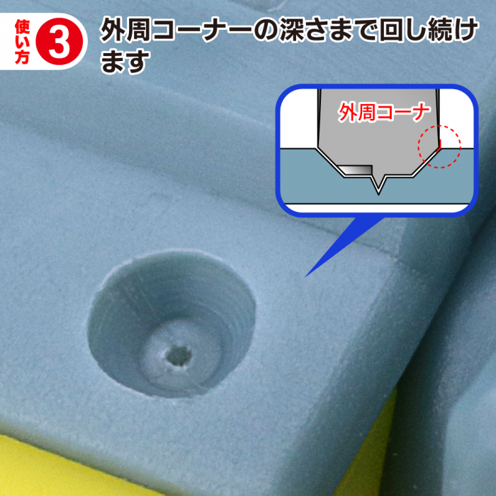 45°に面取りされた丸モールドを下穴なしで掘ることができます
