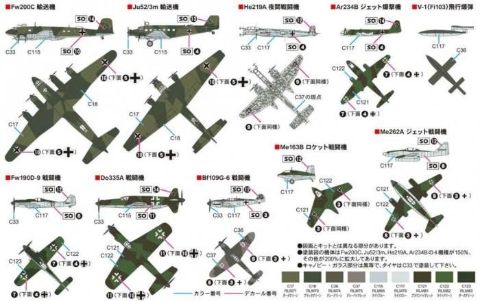 ・Bf109G-6 戦闘機、Me163 ロケット戦闘機、Me262A ジェット戦闘機、Fw190D-9 戦闘機、Do335A 戦闘機、Ar234B ジェット爆撃機 各4機入り