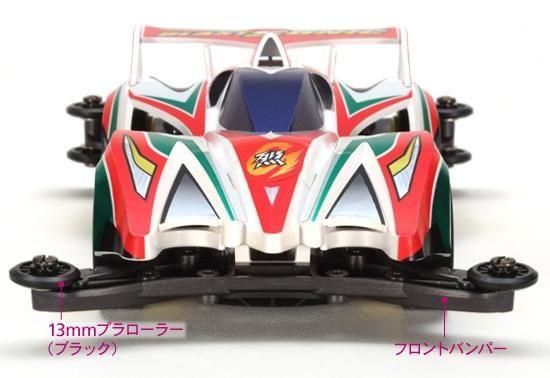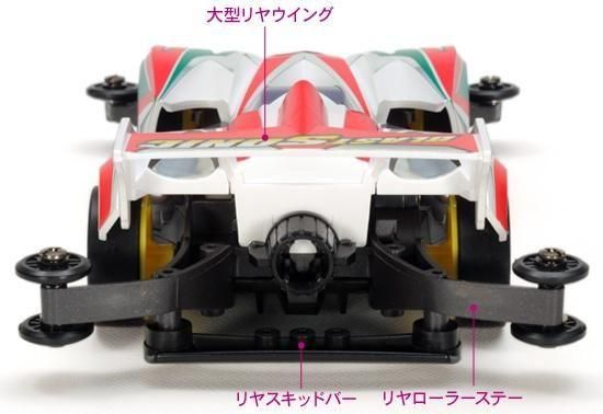 【 ARシャーシ 】空力の追求はもちろん、整備性や剛性、拡張性などミニ四駆レースに必要な要素をかねそなえているのがARシャーシ。ボディ各部から取り込んだ走行風をスムーズに流して、シャーシ内部の電池やモーターを冷やし、熱によるパワーダウンを防止。ボディとシャーシのエアインテークをリンクさせて、高い冷却効果を生み出します。また、低摩擦樹脂製のプラベアリングを装備して、駆動ロスを少なくするとともに軽量化を実現しているのもポイントです。アンダーパネルとディフューザーはボディを外すことなく簡単に取り外し可能。さらに、リヤスキッドバーを標準装備。スロープセクションなどの坂道コースを通過する時に、低摩擦樹脂製のスキッドバーがコース路面と接触。マシンの姿勢を制御してコースアウトを防止します。イエローカラーの5本スポークホイールにローハイトタイヤを装着。3.5:1の超速ギヤ付き。
