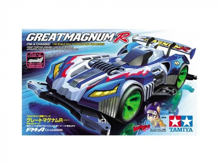 【 進化したマグナムがコースを駆ける!! 】 シャフトドライブ四輪駆動を採用した高性能レーサーのプラスチックモデル組み立てキットです。グレートマグナムR(リボルバー)はミニ四駆マンガ「レッツ&ゴー!!リターンレーサーズ!!」で活躍する主人公、「星馬豪」の中学生時代のマシン。エッジの立った低くワイドなボディや風の流れを整える大型のリアウイングなど、力強い走りを感じさせるフォルムが特徴。また、歴代のマシンに増して拳銃のイメージが強くなったデザインも注目です。ボディはホワイトのABS樹脂製。レッドとブルーで情熱をアピールする炎のグラフィックや、マーキング、ヘッドライトなどはメタリック調のステッカーで用意しました。ノーズのボンネットパネルは取り外しでき、トランクスペースを用意。直径11.5mmのマスダンパーウェイトなどを収納することで、重量バランスのセッティングが楽しめます。