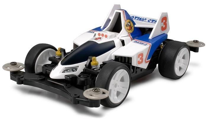 【 スピード感ある個性派フォルムの進駆郎のマシン 】 高性能な走りでレースも楽しい四輪駆動レーサーのプラスチックモデル組み立てキットです。モーター両端のシャフトを伸ばしたダブルシャフトモーターを車体中央に搭載して高い駆動効率を実現。MSシャーシはノーズ、センター、テールの3パートで構成され、ワンタッチで脱着OK。スピーディーで幅広いセッティング変更が楽しめます。ダッシュ3号・流星はダッシュ軍団の一員として活躍した南進駆郎のマシン。前進したキャノピーや張り出したサイドポンツーン、大型エアインテークなど個性的なフォルムをオリジナルのムードもそのままに、漫画原作のテイストも取り入れてMSシャーシ用にリデザイン。4本スポークホイールには大径スリックタイヤを装着し、ノーズユニットはN-02を採用しました。
