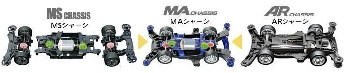 【 駆動効率を追求したMAシャーシ 】MA とは、Midship AERO(ミドシップエアロ)の略。モーターを車体中央に搭載した、ミドシップレイアウトの「MSシャーシ」、走行中の気流(エアロ)を特に意識してデザインされた「ARシャーシ」。それぞれの優れた特徴を1台のシャーシにまとめあげたのがこの「MAシャーシ」です。もちろん、これまでに蓄積されたレーシングノウハウをいかして、3.5:1のギヤ比を採用、6個の低摩擦樹脂ローラーやリヤスキッドバーを標準装備するなど、走行性能も徹底的に磨き上げました。加えて、一体型のモノコック構造の採用で、組み立てやすさやメンテナンス性もさらに向上するなど、初心者からベテランレーサーまで、また、小さめのコースで行われる街かどレースから、大型の特設5レーンサーキットの公認競技会まで、幅広く対応できるシャーシです。
