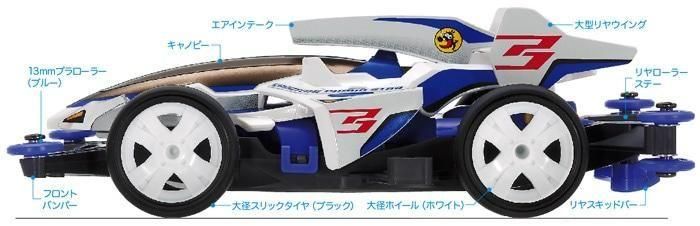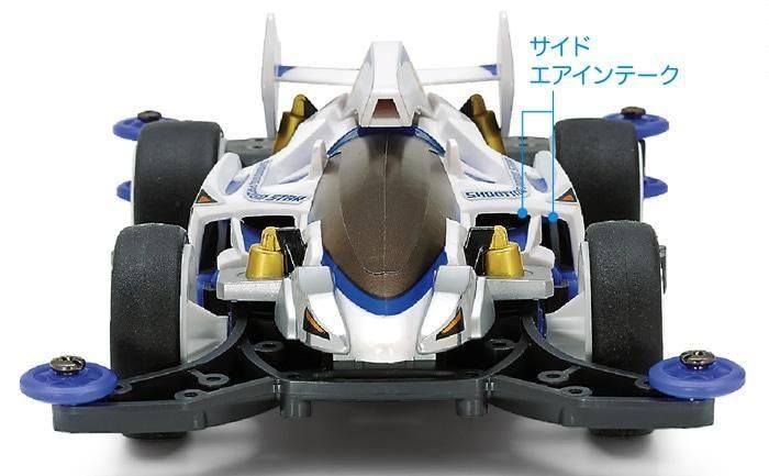 【 名車のDNAを引き継いだ新星マシン 】 ダブルシャフトモーターを搭載した高性能レーサーのプラスチックモデル組み立てキットです。シューティングプラウドスターは、小学館の「コロコロアニキ」に連載中の漫画「ハイパーダッシュ!四駆郎」に登場する南進駆郎の愛車。この漫画の作者であり、このマシンをデザインした武井宏之先生は、実は中学生の頃、ミニ四駆デザインコンテストに応募した作品が入賞し、その作品が進駆郎の愛車、 初代ダッシュ3号シューティングスター となったという経歴を持っています。そのマシンのスタイルをモチーフにして生まれたシューティングプラウドスター。最大の特徴はキャノピー上部にせり出したインパクト十分のエアインテーク。また、サイドのエアインテークやロングキャノピーはいっそうシャープな仕上がり。前後4本のダンパーユニットやウイング後端のブレーキランプなど、細部までこだわった形状が魅力です。シャーシは駆動効率を追求した、ダブルシャフトモーター搭載のMA。ホワイトカラーの大径4本スポークホイールにはスリックタイヤを装着しました。