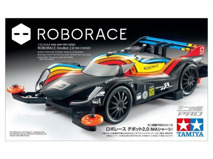 【 最先端のモータースポーツをミニ四駆で体感 】 高性能な走りでレースも楽しい四輪駆動レーサーのプラスチックモデル組み立てキットです。デボット2.0は、AI(人工知能)を搭載した自動運転車によるモータースポーツ、“ROBORACE”で活躍するマシン。特徴的なフロントフェイスや、プロトタイプレーシングカーをベースにしたなめらかなボディスタイルが目を引く最先端のレース車両を、ミニ四駆で実感たっぷりにモデル化しました。また、シャーシは組み立てやすく高性能なMAを採用。ABS樹脂製の本体はダイナミックなボディ形状がいっそう引き立つブラックカラー、低摩擦樹脂製のAパーツはポップな蛍光オレンジとしてアクセントをつけました。そして、フィンスポークホイールには小径ローハイトタイヤを装着。足まわりもブラックでまとめて、実車のシックなイメージが伝わる仕上がりです。ボディに走るカラフルなストライプや、サイドのディスプレイなどは伸びの良いビニール素材のステッカーで表現しました。