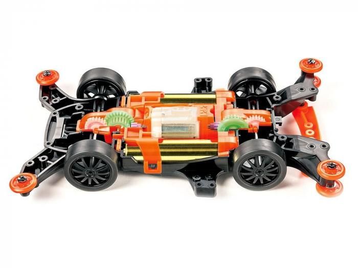 【 駆動効率を追求したMAシャーシ 】 “MA”とは、Midship AERO(ミドシップエアロ)の略。ダブルシャフトモーターを車体中央に搭載したミドシップレイアウトのMSシャーシ、走行中の気流(エアロ)を特に意識してデザインされたARシャーシ。それぞれの優れた特徴を1台のシャーシにまとめあげたのが「MAシャーシ」です。もちろん、これまでに蓄積されたレーシングノウハウをいかして、3.5:1のギヤ比、6個の低摩擦樹脂ローラー、リヤスキッドバーを標準装備するなど、走行性能も徹底的に磨き上げました。加えて、一体型のモノコック構造の採用で組み立てやすさやメンテナンス性もアップ。初心者からベテランレーサーまで、また、小さめのコースで行われる街かどレースから大型の特設5レーンサーキットの公認競技会まで、幅広く対応できるシャーシです。