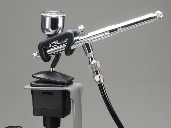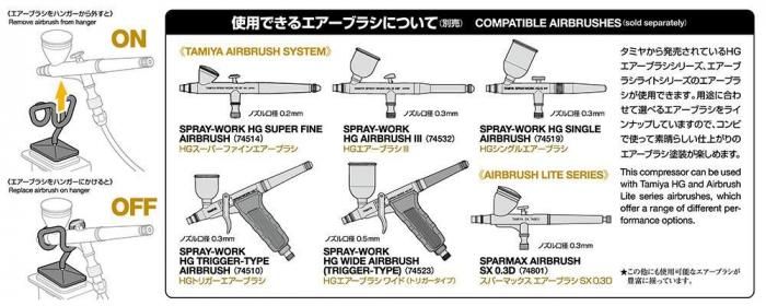 エアーブラシをハンガーから持ち上げると電源ON、戻すとOFFとなるスイッチを採用。塗装時に煩わしい電源のON、OFF作業から解放されます。
