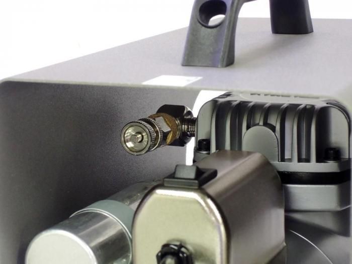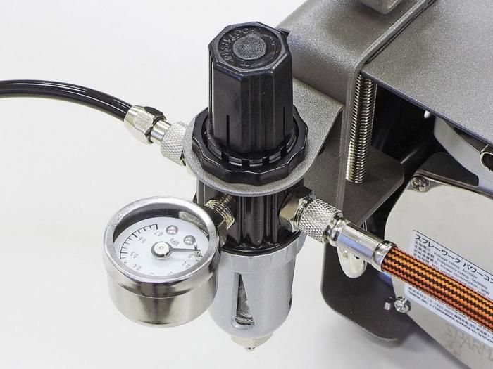 エアー圧の調整と水抜き機能を備えたメーター付きレギュレーター。高圧のコンプレッサーで問題となる水滴の吹き出しを抑えます。