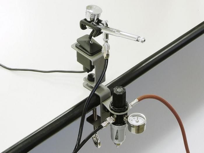 エアーブラシハンガーとレギュレーターはクランプ固定により一体化。本体カバー
