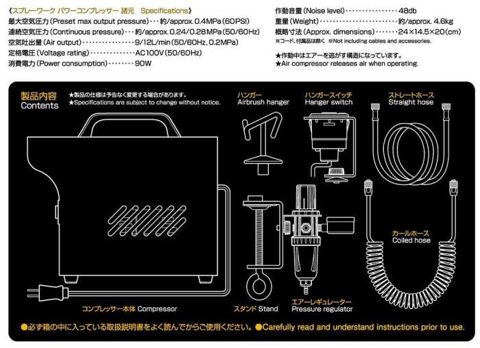 ● 家庭用電源(AC100V,50/60Hz)専用 ●本体寸法 W24cm×D14、5cm×H20cm ●最大空気圧力約0.4MPa(60PSI) ●連続空気圧力 約0.24/0.28MPa(50/60Hz) ●空気吐出量9/12L/min(50/60Hz、0.2MPa) ●定格電圧AC100V(50/60Hz) ●消費電力90W ●作動音量48db ●重量 約4.6kg ●付属品 エアーレギュレーター、スイッチ機能付きエアーブラシスタンド、固定用クランプ、ホース ●連続使用可能時間 40分。