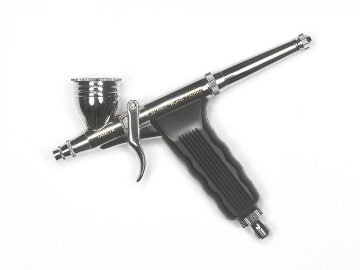 【 手入れが手軽なカップ一体型トリガーエアーブラシ 】 タミヤスプレーワークシリーズの各コンプレッサーやエアー缶に接続できる、ダブルアクションタイプの高性能エアーブラシです。操作が簡単で長時間の作業でも疲れにくいトリガー(引き金)式。グリップは握りやすい樹脂製です。ノズル口径0.3mmのスタンダードモデル。幅1mm以下の細い吹きつけができ、ボカシ塗装や全面塗装まで幅広くこなします。容量7ccの塗料カップは洗いやすい一体型で、残りやすいメタリック塗料の粒子などもきれいに取り除け、塗料のたれを防ぐ溝も付いています。タミヤのアクリル塗料やエナメル塗料、またラッカー系塗料など薄めることのできるほとんどの塗料が使えます。