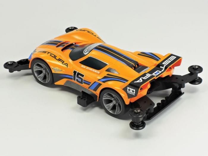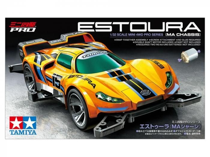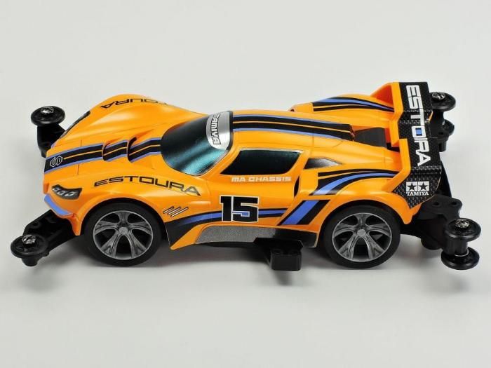 【 躍動フォルムにほとばしる爆発のエナジー 】 高性能な走りでレースも楽しい四輪駆動レーサーのプラスチックモデル組み立てキットです。エストゥーラはガルウイングドアを備えたミドシップレーシングカーをモチーフにしたマシン。ポルトガル語で「爆発する・炸裂する」という意味を持つマシン名の通り、パワフルな走りを予感させるソフトオレンジカラーのボディが魅力たっぷり。また、中央が凹んだ個性的な形のリヤウイングも目を引くポイント。ボンネットフードのエアアウトレットや、躍動感あふれるエアロフォルムとあいまって、レーシングムードは満点です。シャーシは組み立てやすく強度の高いMAシャーシを採用して、シルバーのAスポークホイールには小径ローハイトタイヤを装着。スタイリングを引き締めるストライプや、マシン名のロゴなどはメタリック調のステッカーで表現しました。