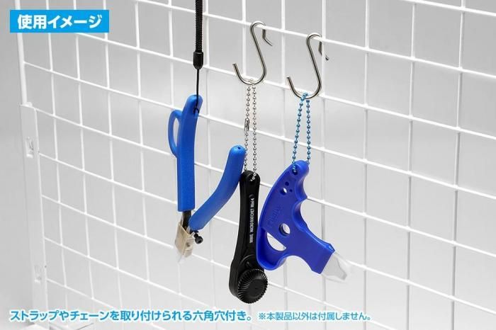 パーツの軸や丸棒のサイズを測るのに便利な3種類の丸穴と、ストラップなどを取り付けられる対辺4mmの六角穴付き。