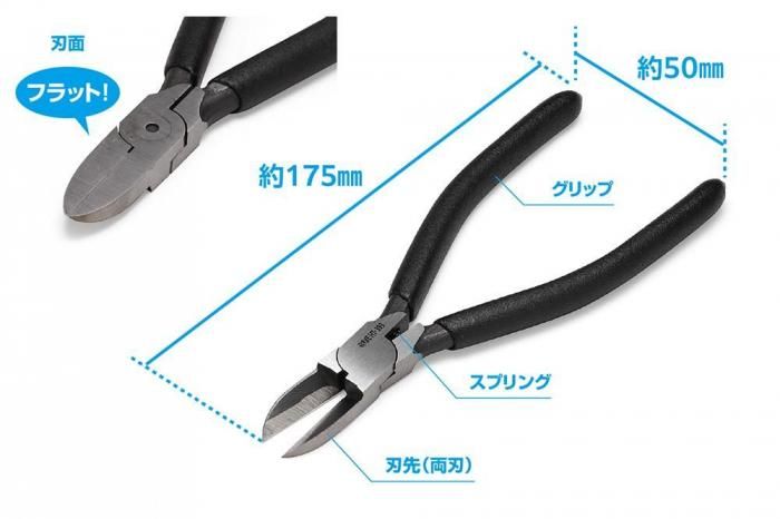プラ板の切り出しや、パーツの切断などに便利な刃先が長めのフラットタイプニッパー(両刃タイプ)。