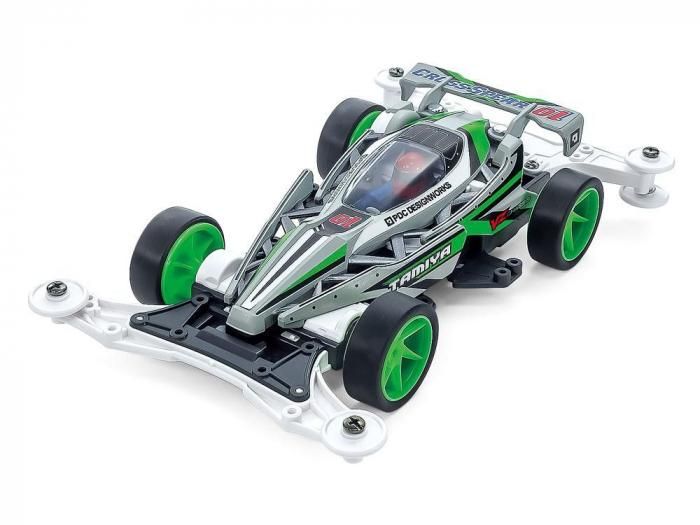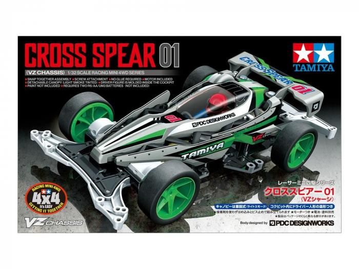 【 個性派ボディが魅せる、低重心の走り 】 シャフトドライブ四輪駆動を採用した高性能レーサーのプラスチックモデル組み立てキットです。クロススピアー01は、『DCR(デクロス)』シリーズや『デュアルリッジJr.』でおなじみのハイパーデザイナー・やまざきたかゆき氏がデザイン。ミニ四駆『レイスピアー』の名前を引き継ぐこのマシンは、車体左右のサイドパネルをセンター部分から離してトラス構造で支えるユニークな形と、スピアー(槍)のような鋭いフォルムが注目です。ステルス戦闘機をイメージしたライトグレイのボディは、軽く・低いフォルムに徹底的にこだわって、低重心ならではの安定感ある走りを追求。脱着可能なキャノピーはクリヤーの別パーツで用意しました。シャーシは軽量・コンパクトなVZを採用し、本体はジャーマングレイ、ローラーやギヤカバーなどのAパーツはホワイトでコーディネート。蛍光グリーンのスパイラルホイールにはブラックのスーパーハード小径ローハイトタイヤを装着しました。実戦向きの軽量ボディとVZシャーシは相性抜群。レースで活躍間違いなしの注目の1台です。