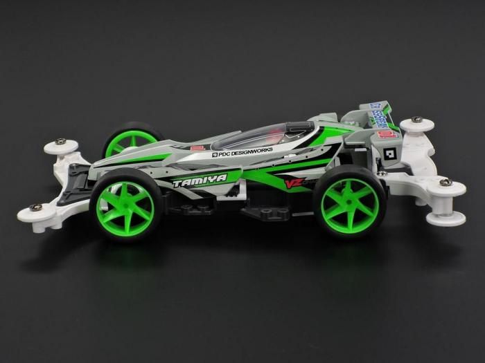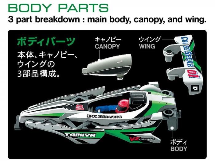 【 強度と拡張性を追求したVZシャーシ 】 レースでも使われて人気が高い、小型・軽量・ショートホイールベースのVSシャーシの性能をさらに磨き上げたのがVZシャーシです。小回り性能やメンテナンス性の高さなど、VSシャーシの優れた特長はそのままに、バンパー、リヤステー基部、プロペラシャフト軸受けなどの強度をアップ。衝撃を吸収する適度な“しなり”もポイントです。また、リヤローラーステーに加えてフロントバンパーも分割が可能。セッティングの自由度も大幅に向上しています。そして、シャフトの軸受けは摩擦抵抗の少ないPOM樹脂製の620プラベアリングを採用。シャーシ本体とギヤカバーなどのAパーツはともにABS樹脂製です。ギヤ比は3.5:1をセットしました。