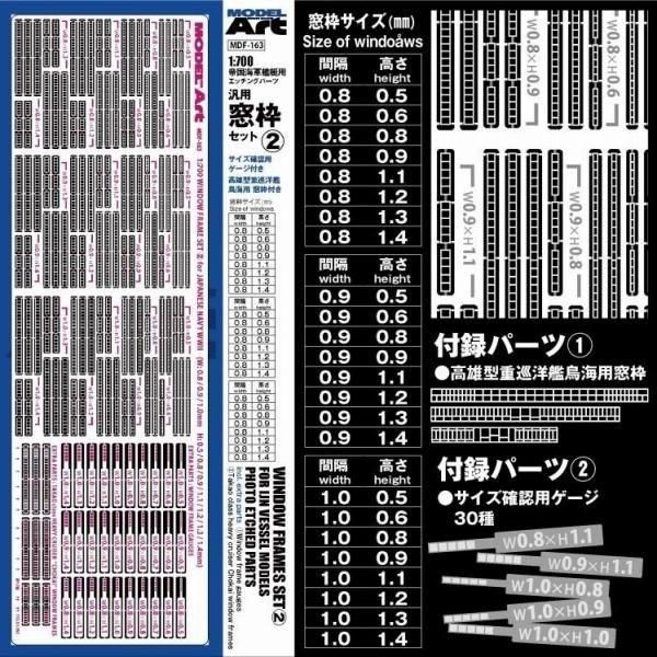 本製品は艦橋部分の精密化に役立てていただくことを意図した、1:700 帝国海軍艦艇用エッチングパーツパーツ汎用 窓枠セットの第二弾です。 今回は、高さ0.5mm、0.6mm、0.8mm、0.9mm、1.1mm、1.2mm、1.3mm、1.4mmの窓枠を用意しました。高さ1.0mm、0.7mmは、第一弾(MDF-144)をご購入ください。