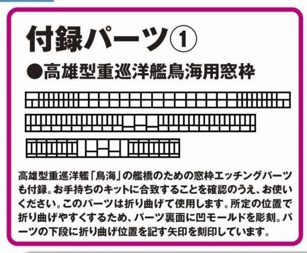 ● 高雄型重巡洋艦「鳥海」の艦橋のための窓枠エッチングパーツも付録しました。お手持ちのキットに合致するのを確認のうえ、お使いください。このパーツは折り曲げて使用します。所定の位置で折り曲げやすくするため、パーツ裏面に凹モールドを彫刻しています。パーツの下段に折り曲げ位置を記す矢印を刻印していますので参考にしてください。
