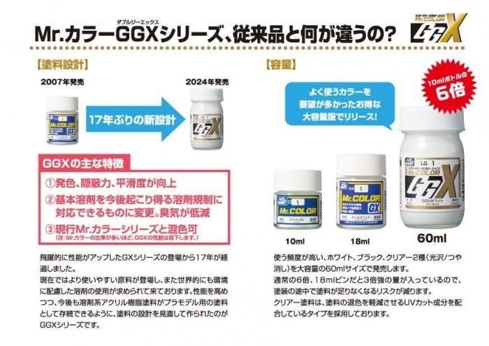 ・既存のMr.カラーシリーズと混色が可能(ただし、混ぜた分だけGGX本来の性能が低下します。)