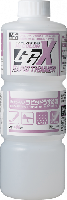 ・Mr.カラーGGX用に設計されたうすめ液です。従来のMr.カラーの希釈にも使用できますが、乾燥速度設計の違いなどから、メタリック塗料などは仕上がりがうまくいかない場合がございます。