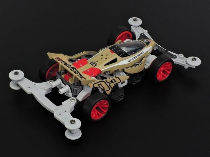 【 基本スペック 】●完成時の全長158mm、全幅98mm、全高44mm ●モーターつき ●組み立ては接着剤不要のはめ込み式 ●スーパーハード小径ローハイトタイヤ(ブラック)を装着 ※硬いタイヤのため、強く押し込んで装着します。