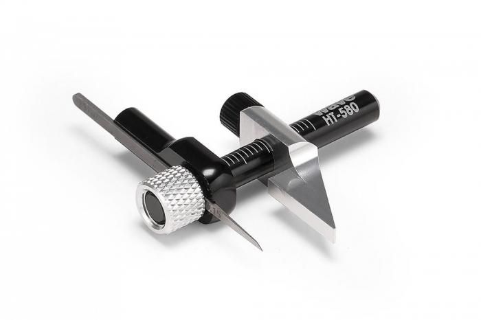 プラスチックやレジンパーツ等のスジ彫り作業に役立つ精密チゼル刃とグリップのセット。