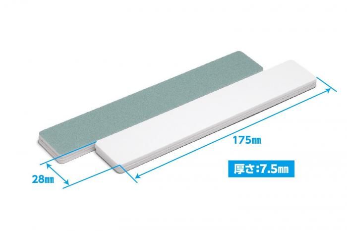 ヤスリスティック本体は、芯になる中央部には硬質ベースを、その上下を軟質ベースではさんだ3層構造とし、両面に性質の異なる研磨シートをセットしました。