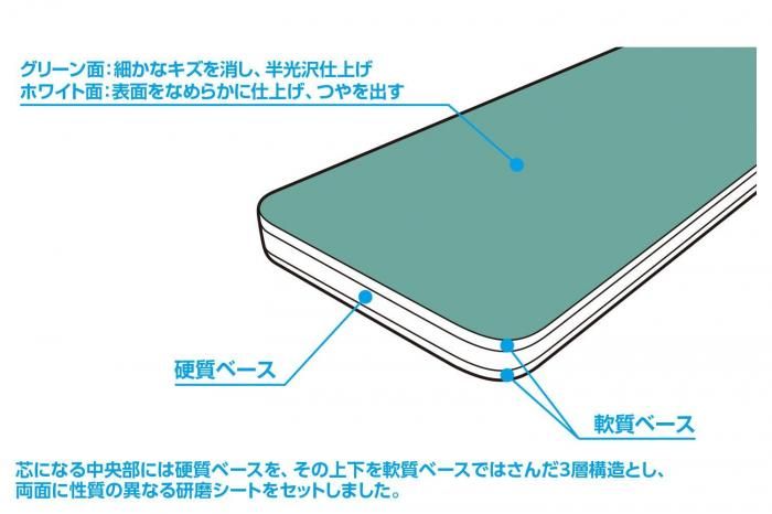 ヤスリスティック本体は、芯になる中央部には硬質ベースを、その上下を軟質ベースではさんだ3層構造とし、両面に性質の異なる研磨シートをセットしました。