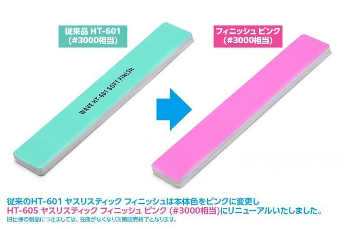 従来のHT-601 ヤスリスティック フィニッシュは本体色をピンクに変更し、本製品HT-605 ヤスリスティック フィニッシュ ピンク(#3000相当)にリニューアルいたしました。