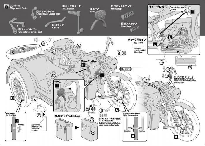 ナンバープレートやエンブレムなどはエッチングによる精密さで表現しつつ、スポークを再現したタイヤ、各種レバー類、ホーン、ステップなどは3Dプリントパーツとして同梱しています。