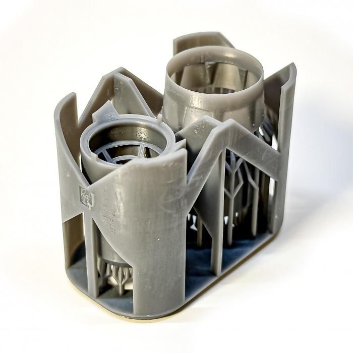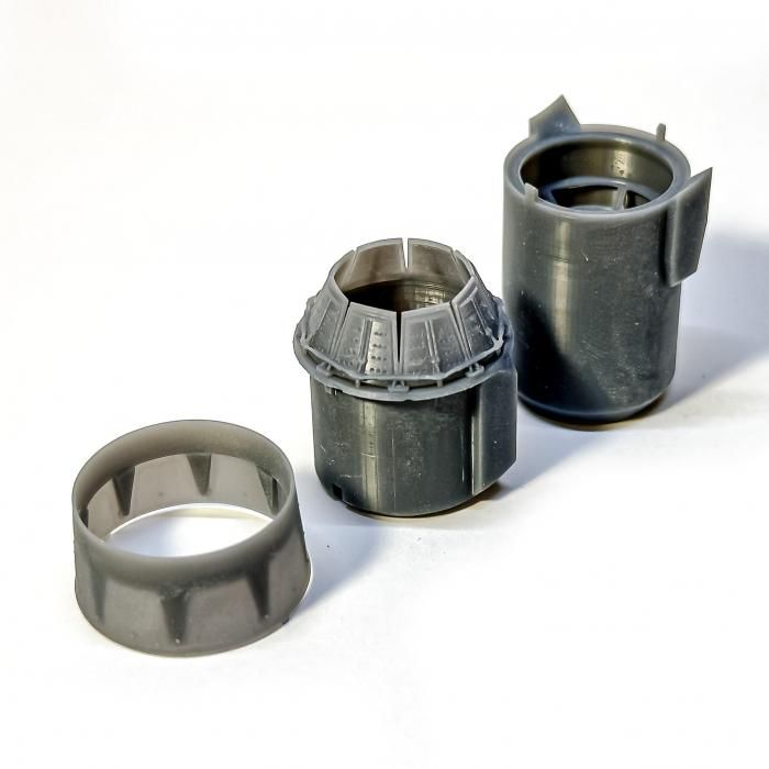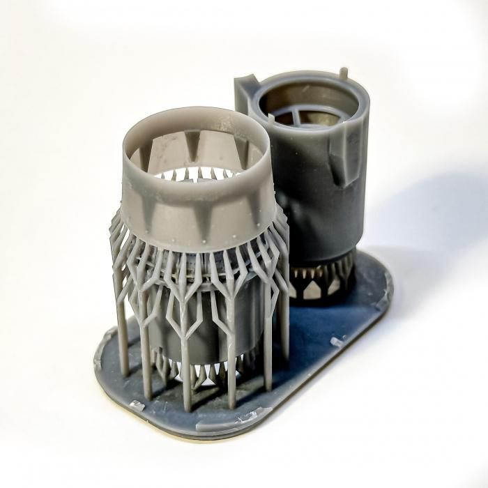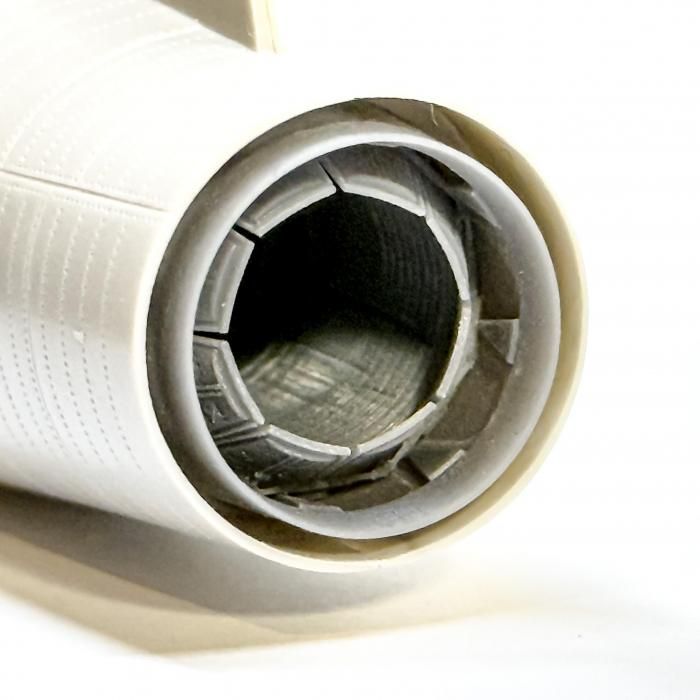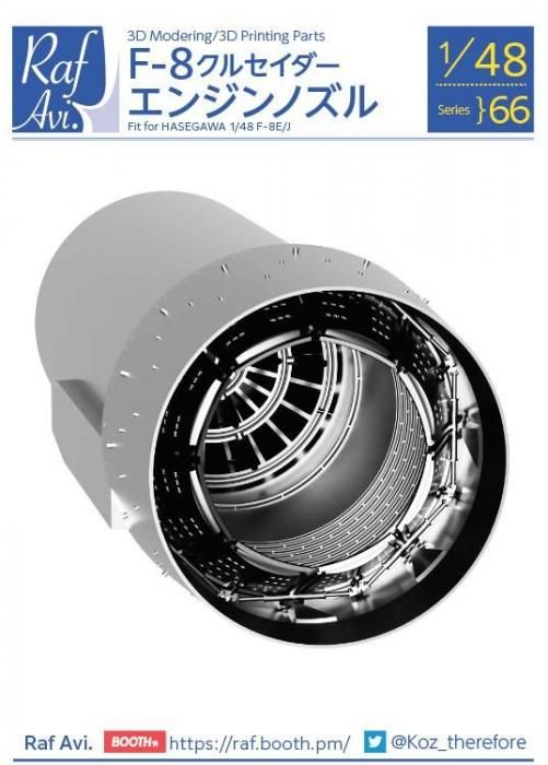 F-8はJ57-P-20エンジンを搭載しており、プラット・アンド・ホイットニー社ではJT3Cの名称で呼ばれています。資料を確認すると、ノズルのアイリスを覆うカバー部分には3種類ほどの形状があるようですが、本パーツではF-8E/Jに搭載された、アイリスが前方に収まる円筒形状を再現しています。アイリス自体は全閉に近い状態で表現し、オグメンタのパイプやフレームホルダーも忠実にモデリングしました。ハセガワ1/48 F-8E/Jキットに無加工で装着可能な形状・サイズで設計しており、胴体貼り合わせ後でも胴体後端から差し込むことができます。