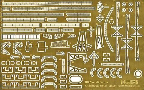 エッチングパーツには手摺、無線檣(しょう)、通信檣、煙突周り付加物(分離板、ジャッキステー、トラス構造の煙突の支え)、ループアンテナ、クレーン、菊花紋章、着艦指導灯(艦尾信号灯、照星灯)などを収録。