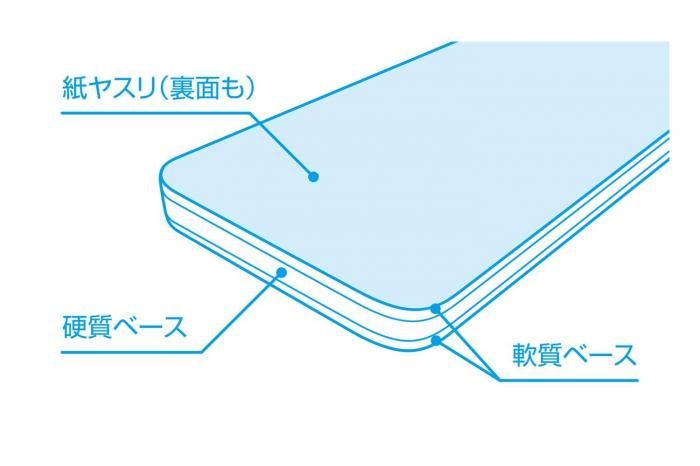 ヤスリスティック本体は、芯になる中央部には硬質ベースを、その上下を軟質ベースではさんだ3層構造とし、両面に紙やすりをセットしました。 ヤスリスティック本体はお好みの形に切り出すことができ、作業場所にあわせた形状に加工することができます。